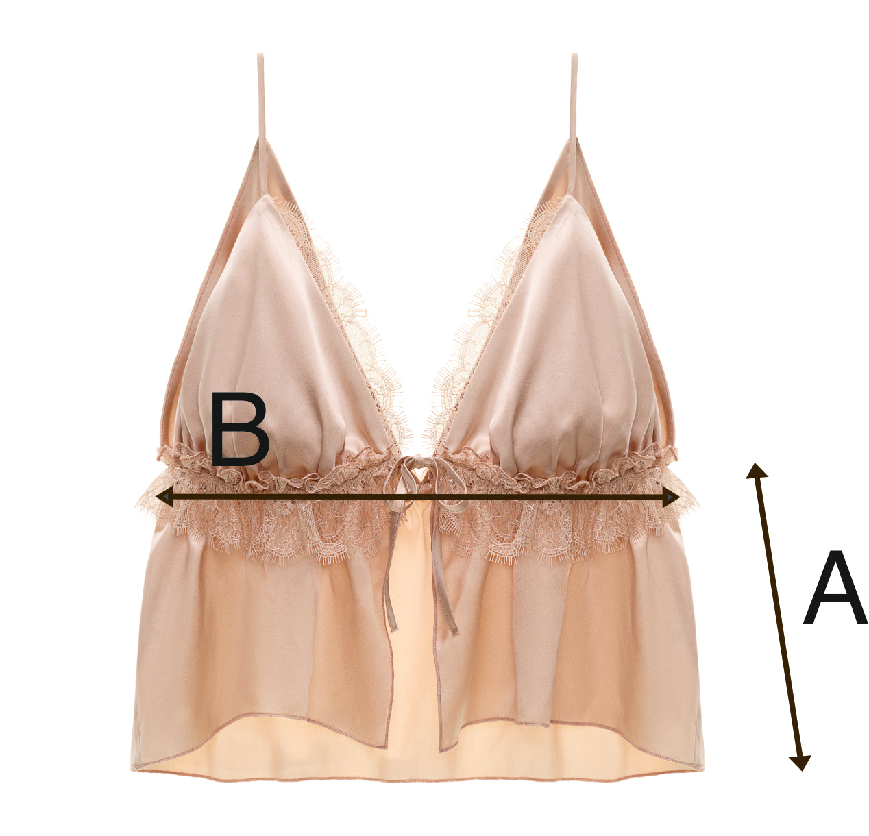 Model wyróżnia się cienkimi ramiączkami i głębokim dekoltem w kształcie litery V, ozdobionym wiązaniem na drobną kokardkę. Gumka wszyta pod biustem subtelnie dopasowuje top do ciała, a podwójne falbanki nadają mu lekkości i zmysłowego rytmu.